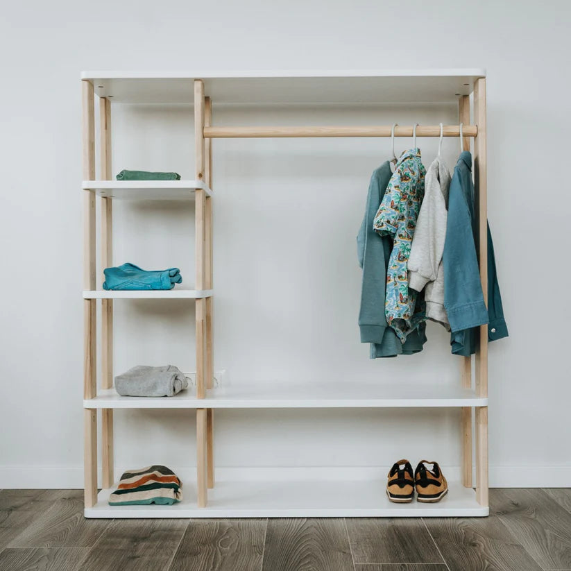 Wählen Sie zwischen einer vollständigen Naturholzoberfläche oder weißen Regalböden mit Holzrahmen