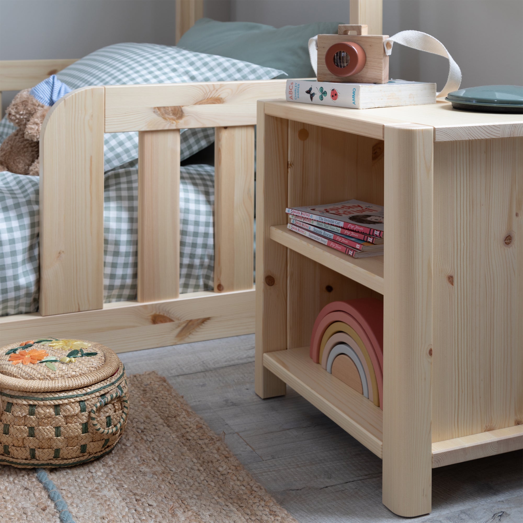 Available with open shelving or a single soft-close drawer, and in two neutral, child-safe water-based wax finishes, this bedside table is designed to coordinate seamlessly with the Roomix toddler bed range.
