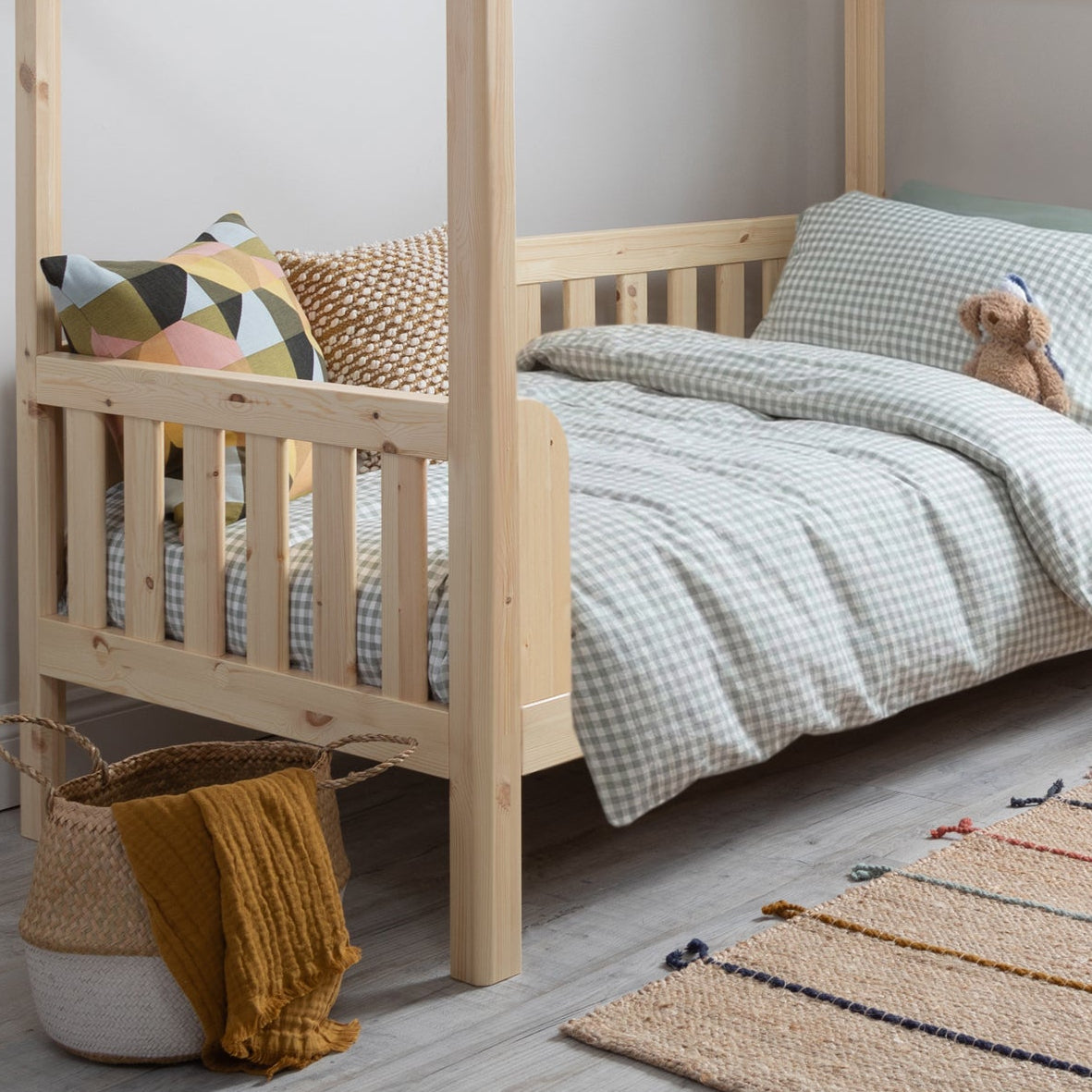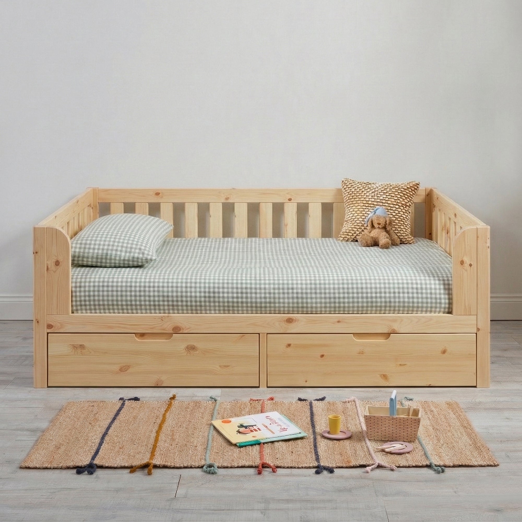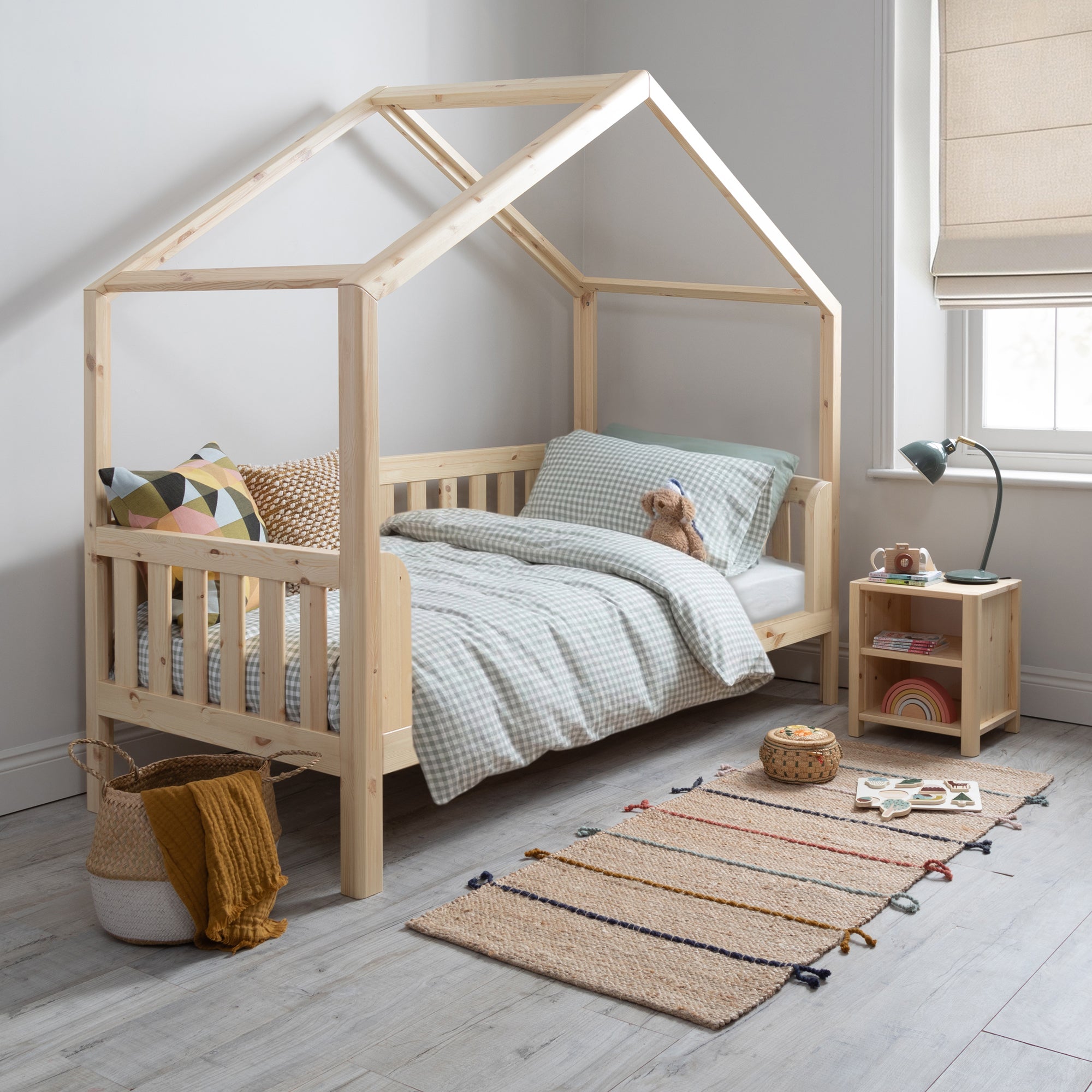 Funktioniert sowohl mit dem Übergangsbett für Kleinkinder als auch mit dem Kleinkind-Hausbett und verwandelt es in ein einfaches Tagesbett