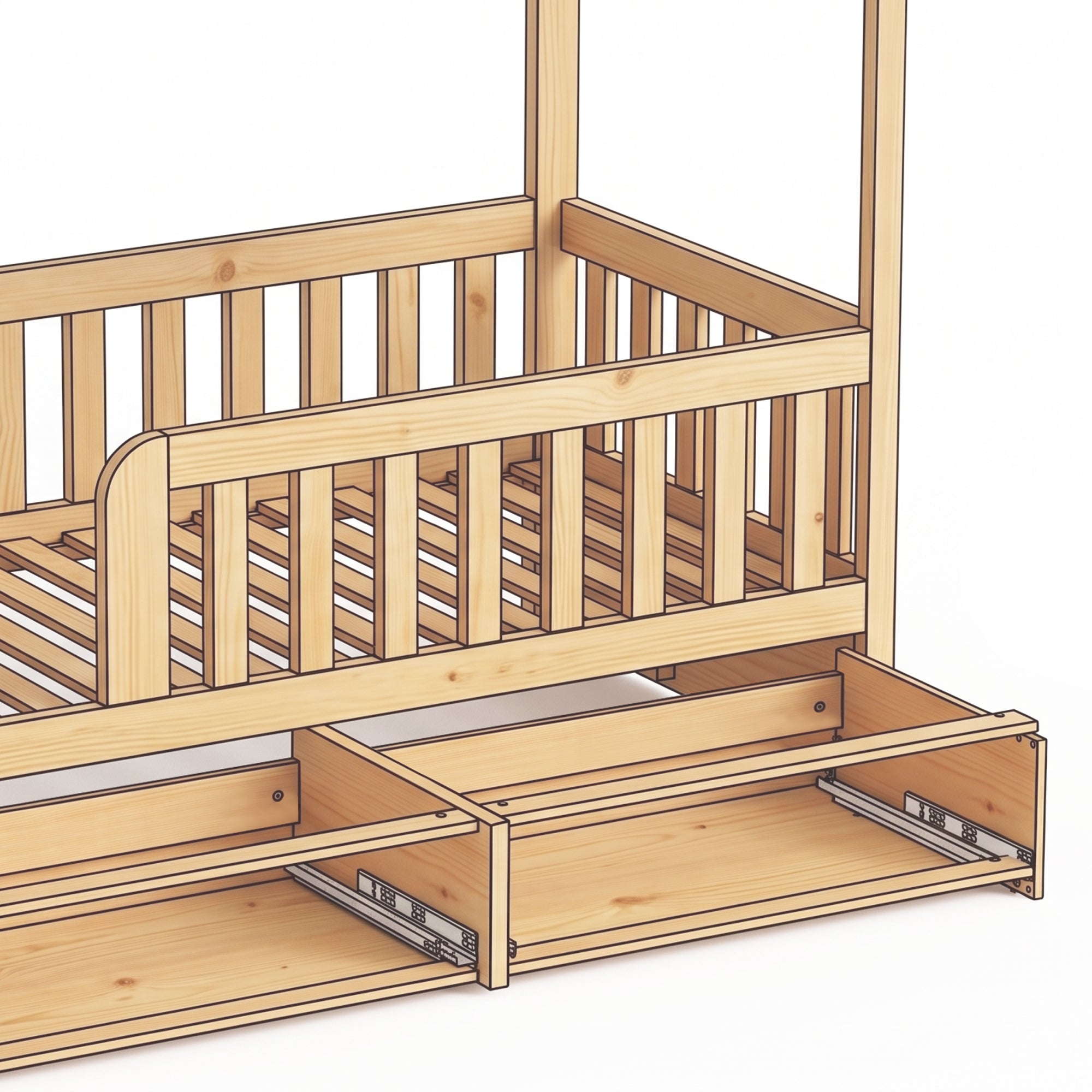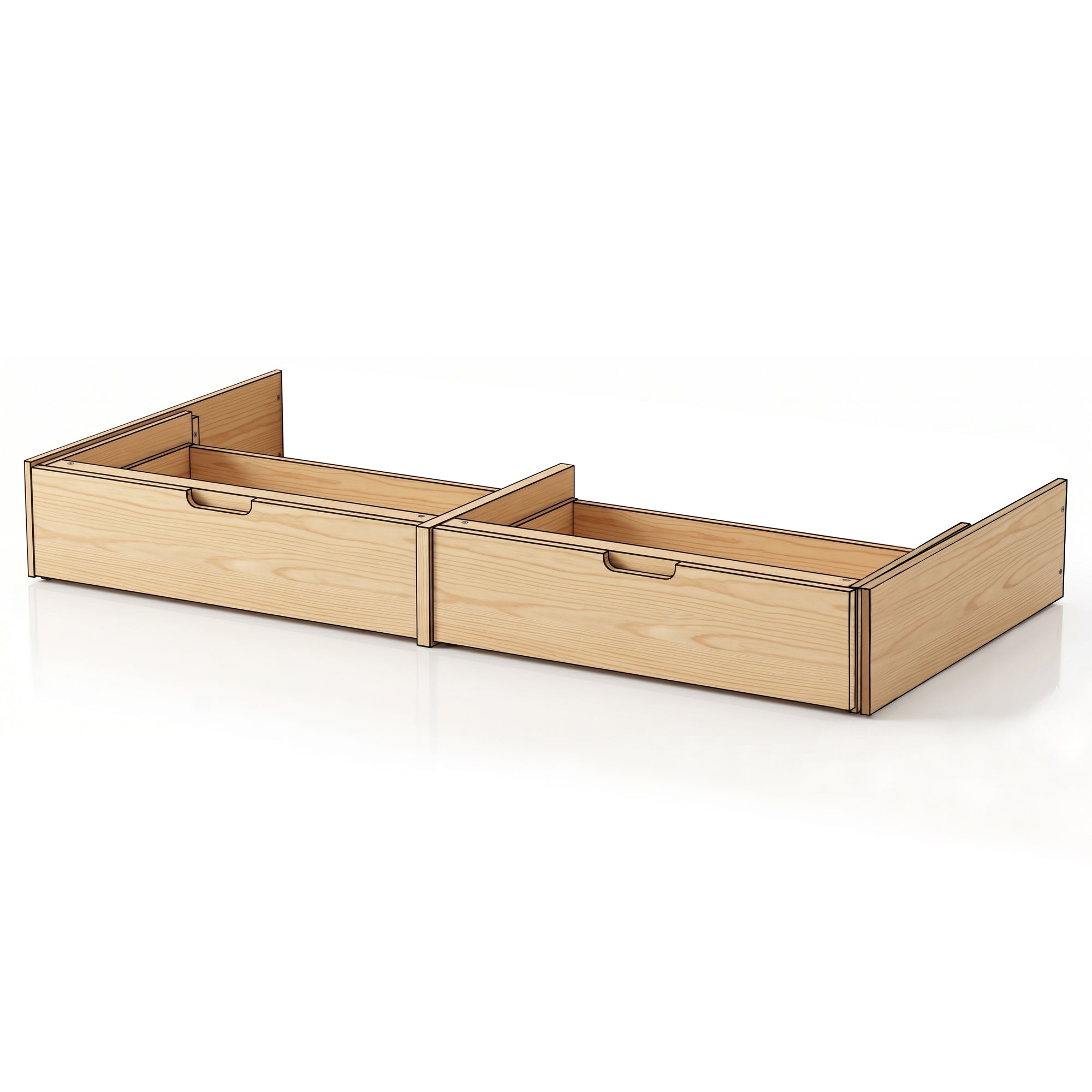 Unser Bettkasten-Set kann als Ergänzung zu allen unseren erhöhten Transition-Betten und Hausbetten in beiden Ausführungen und in vier Größen erworben werden. Unsere Schubladen werden mit einem massiven Kiefernplattenpaket geliefert, das den Bettboden komplett verschließt. Die Schubladen sind großzügig dimensioniert und verfügen über Soft-Close-Schienen.